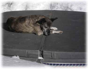 This last winter, 2008, was very hard on Cheyenne. She couldn't walk in the deep snow, and every day we had to pack down a trail on snowshoes for her to walk on in the back yard. I was totally amazed one day when she made the monumental decision to leave the snowshoe track and head for the only warm surface she could find! Oh, what a wonderful find it was! Normally, the hot tub stands a good 4 feet off the ground, but with the snow about a half foot taller, she felt she could chance it ~ and she "jumped" across to the warmest surface around! |